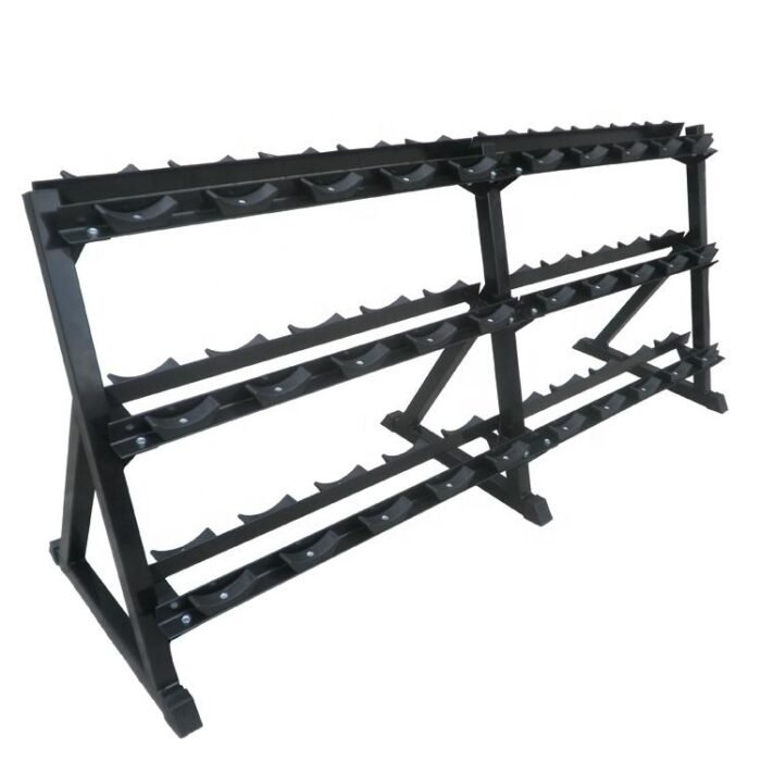 - Angled Tier Design – Sleek three-tier layout with angled shelves enables users to easily pick up and return dumbbells, reducing awkward reaches or bending and improving workout flow.
